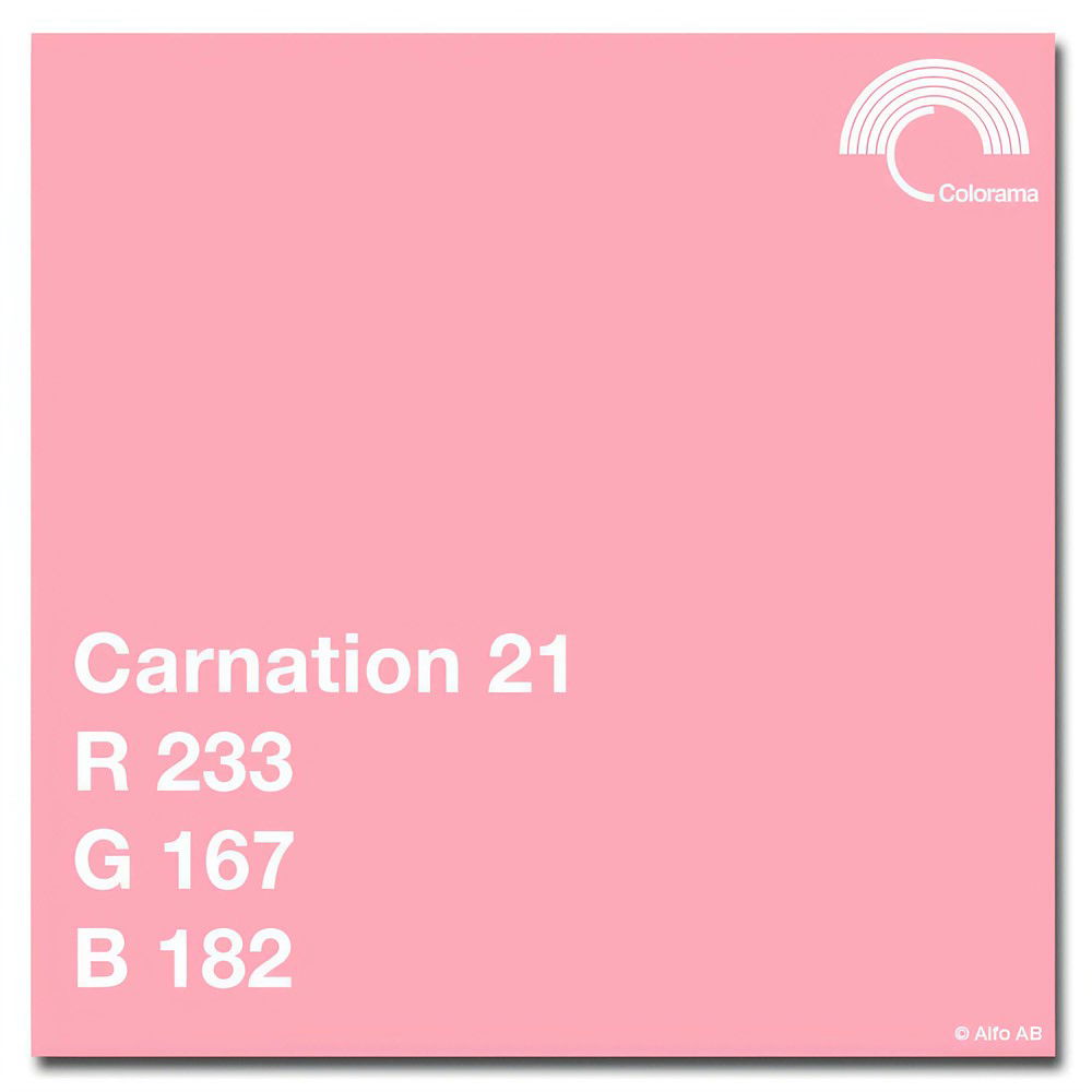 Carnation har färgkoden 21. För att ge en uppfattning om nyansen visas ett exempel i Adobe RGB ovan. För exakt färgåtergivning krävs en kalibrerad skärm och korrekt ljussättning. För absolut färgprecision rekommenderas Colorama Swatch-färgkarta, tillgänglig via kundtjänst.